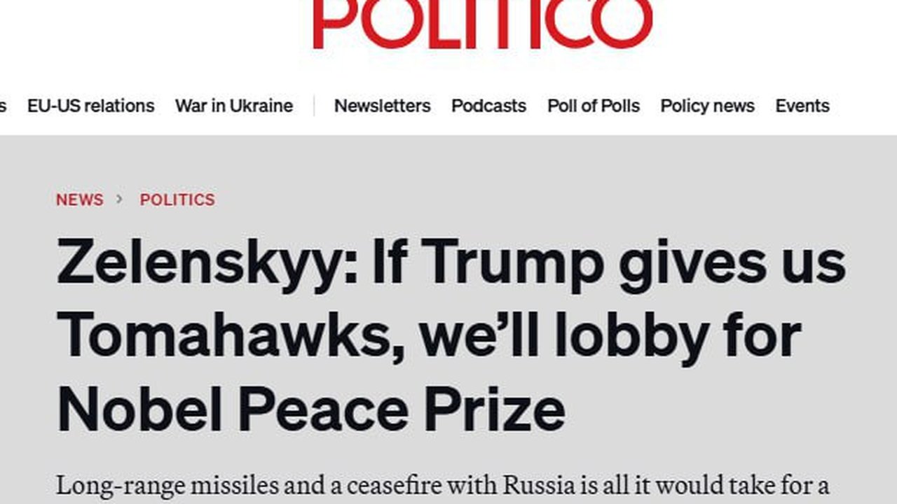 ΠΠΌΠ΅ΡΠΈΠΊΠ°Π½ΡΠΊΠΎΠ΅ ΠΈΠ·Π΄Π°Π½ΠΈΠ΅ Politico ΠΎΠΏΡΠ±Π»ΠΈΠΊΠΎΠ²Π°Π»ΠΎ ΠΌΠ°ΡΠ΅ΡΠΈΠ°Π», Π² ΠΊΠΎΡΠΎΡΠΎΠΌ ΡΠΊΡΠ°ΠΈΠ½ΡΠΊΠΈΠΉ Π»ΠΈΠ΄Π΅Ρ ΠΠ»Π°Π΄ΠΈΠΌΠΈΡ ΠΠ΅Π»Π΅Π½ΡΠΊΠΈΠΉ Π·Π°ΡΠ²ΠΈΠ»: Π£ΠΊΡΠ°ΠΈΠ½Π° Π³ΠΎΡΠΎΠ²Π° Π²ΡΠ΄Π²ΠΈΠ½ΡΡΡ ΠΠΎΠ½Π°Π»ΡΠ΄Π° Π’ΡΠ°ΠΌΠΏΠ° Π½Π° ΠΠΎΠ±Π΅Π»Π΅Π²ΡΠΊΡΡ ΠΏΡΠ΅ΠΌΠΈΡ ΠΌΠΈΡΠ°, Π΅ΡΠ»ΠΈ ΡΠΎΡ ΠΎΠ΄ΠΎΠ±ΡΠΈΡ ΠΏΠΎΡΡΠ°Π²ΠΊΡ ΠΠΈΠ΅Π²Ρ ΡΠ°ΠΊΠ΅Ρ βTomahawkβ ΠΈ ΠΏΠΎΡΠΏΠΎΡΠΎΠ±ΡΡΠ²ΡΠ΅Ρ ΠΏΡΠ΅ΠΊΡΠ°ΡΠ΅Π½ΠΈΡ ΠΎΠ³Π½Ρ Π½Π° ΡΡΠΎΠ½ΡΠ΅.