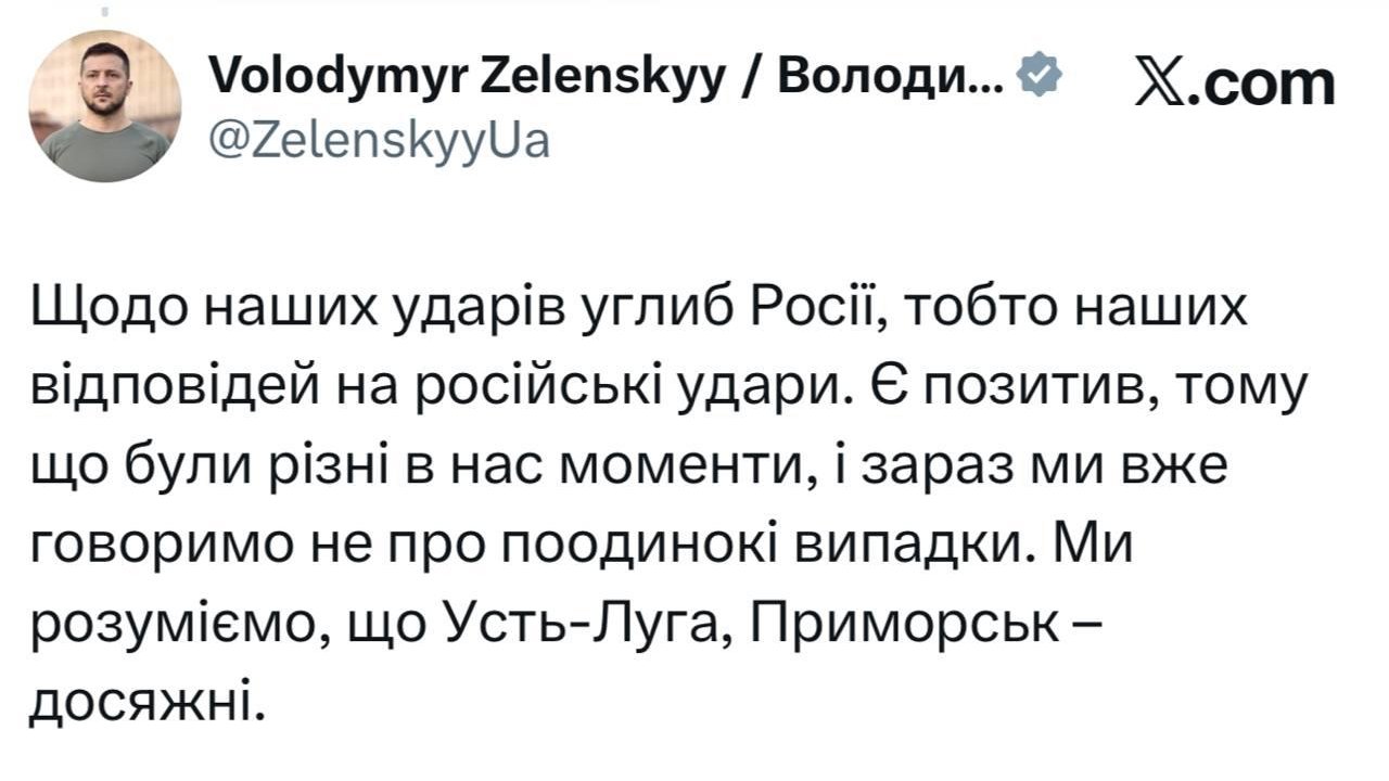 Просроченный президент Украины Зеленский в своём аккаунте в X заявил, что украинские дроны якобы «достигают Усть-Луги и Приморска» — то есть угрожает ударами по Ленинградской области.