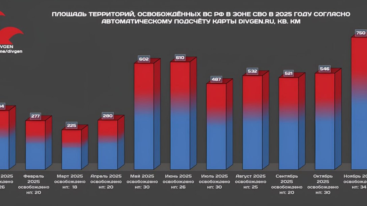 Аналитический сервис DIVGEN представил данные о темпах освобождения территорий за 2025 год. График показывает: продвижение российских войск идёт стабильно весь год, а к осени набрало максимальный темп.