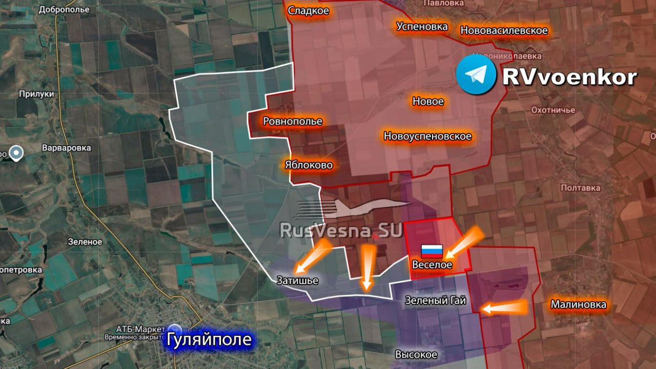 🔻 Гуляйпольское направлениеМинобороны подтверждает освобождение Весёлого восточнее Гуляйполя. Вместе с селом под контроль перешёл участок местности порядка 15 кв. км.На линии Зелёный Гай — Червонное продолжаются тяжёлые бои, причём ситуация развивается в пользу наших.Практически завершена борьба за Затишье.От Ровнополья наши подразделения продвинулись до двух километров в сторону реки Гайчур.На пути к Покровскому идут столкновения у Нового Запорожья и Радостного.С юга, от Нечаевки, продолжается продвижение в сторону Остаповского и Герасимовки.Под Гаем противник пытается контратаковать, однако наши удерживают Отрадное.В районе Волчьего, Тихого и Коломийцев наши бойцы вышли почти по всей линии к южному берегу Волчьей. В Новопавловке — ожесточённые бои.